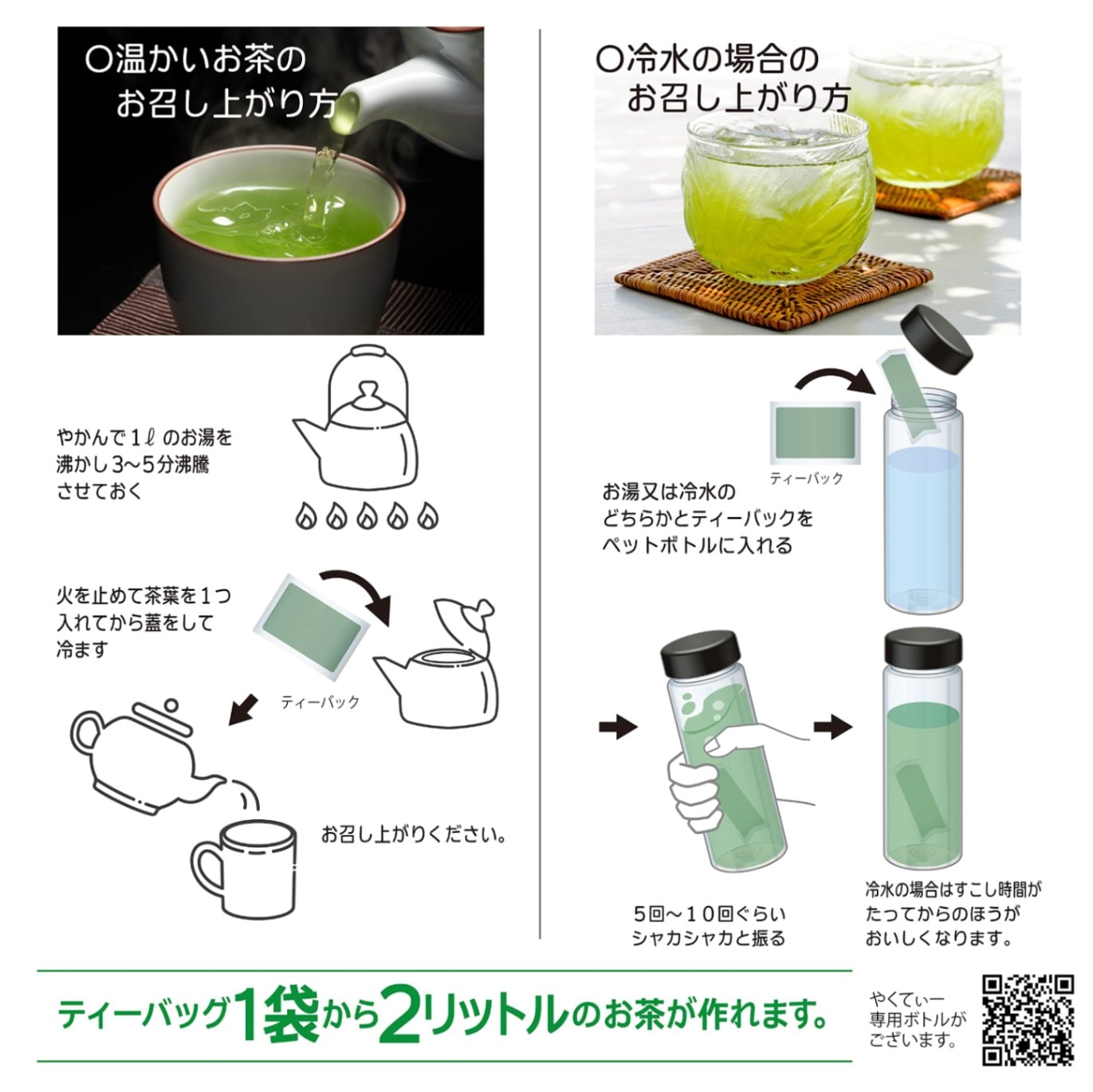 [お召し上がり方] お湯又は冷水のどちらかとティーバックを ペットボトルに入れ5回~10回ぐらい シャカシャカと振ると飲みごろになります。
